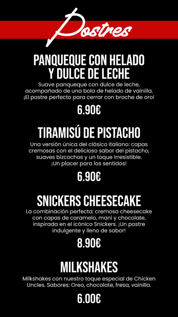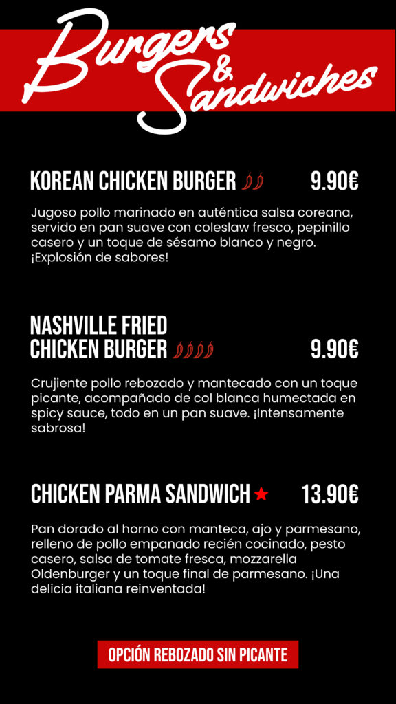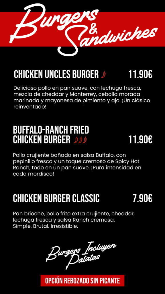 Inicio CARTA CC THADER CARTA CC THADER Reservar Tabla de Alérgenos. Pincha Aquí Elige tu salsa Por 1.50€ extra MielSalsa AlfredoSalsa BarbacoaBuffaloChick-Fil-ASalsa KoreanaSalsa NashvillePimenton y ajoRaising CanesRanch HomemadeSpicy Hot Ranch Tabla de Alérgenos. Pincha Aquí